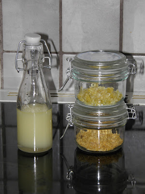 Når der ikke er noget der skal gå til spilde, så bliver der eksperimenteret. Jeg har derfor forsøgt med kandiseret citronskal, citronsirup og tørret citronskal.