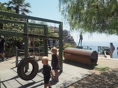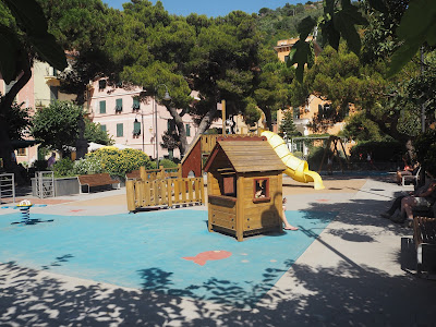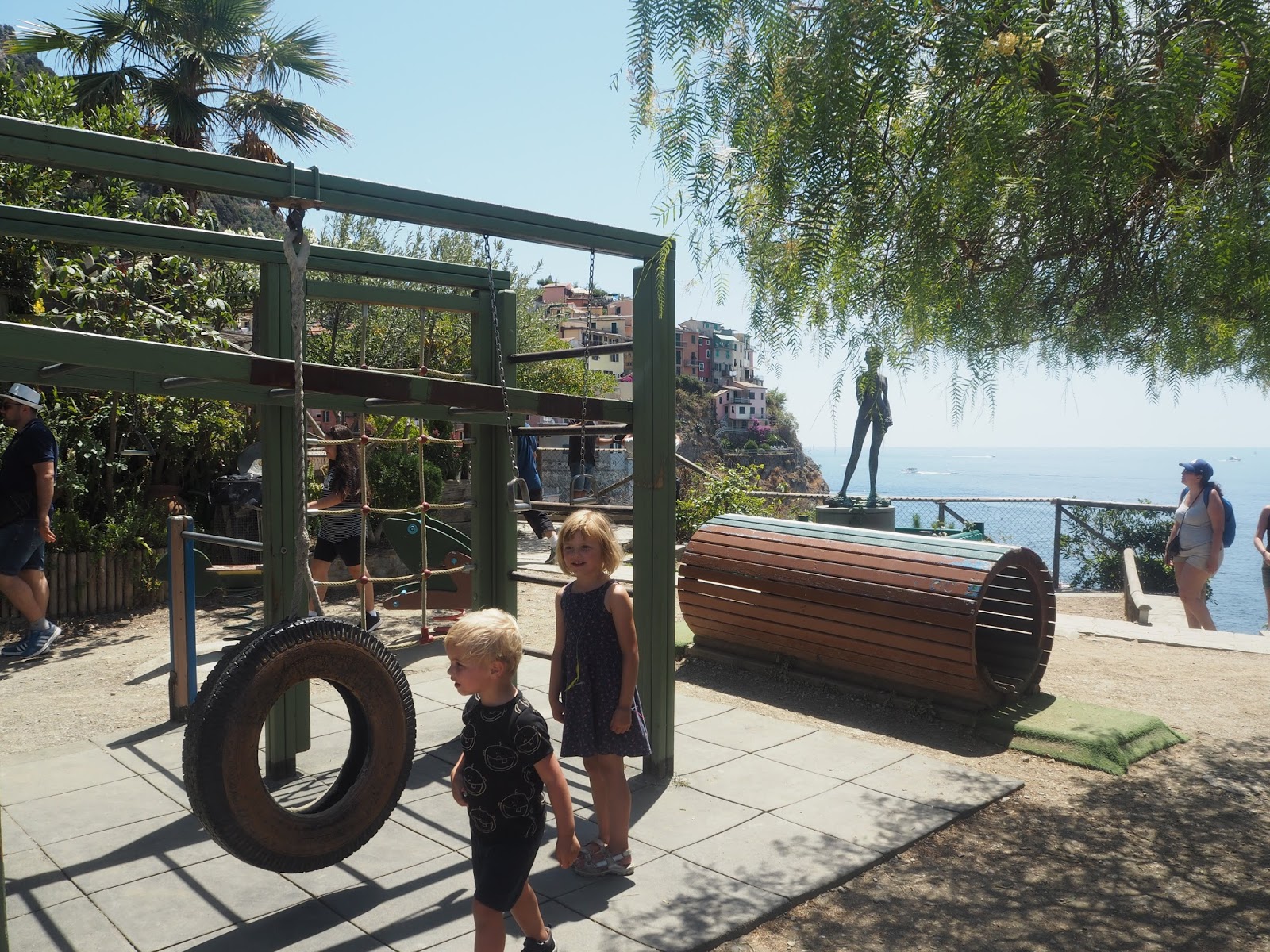 Vi var i Manarola kl 12.45 og havde lovet børnene legepladstid. Når du kommer fra borde står du på klipperne til højre for byen. Her skal du gå mod venstre og følge stien langs kanten, så ligger legepladsen på toppen med den smukkeste udsigt over by og hav. Her er også toiletter lige ved siden af.
