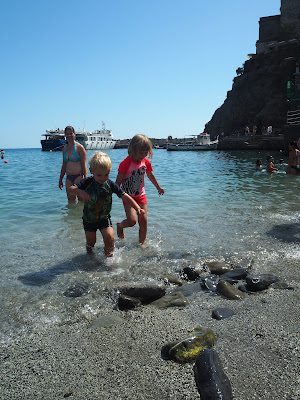 Det betød godt nok at vi ikke ville se byen Corniglia, da den ligger for højt oppe på klipperne, men vi ville få den flotte udsigt til klipperne og samtidig er en sejltur oplagt med små børn. Det inkluderer vand og hvad er sejere end at bade i vandet når man er 2 og 4 år -at sejle på vandet.