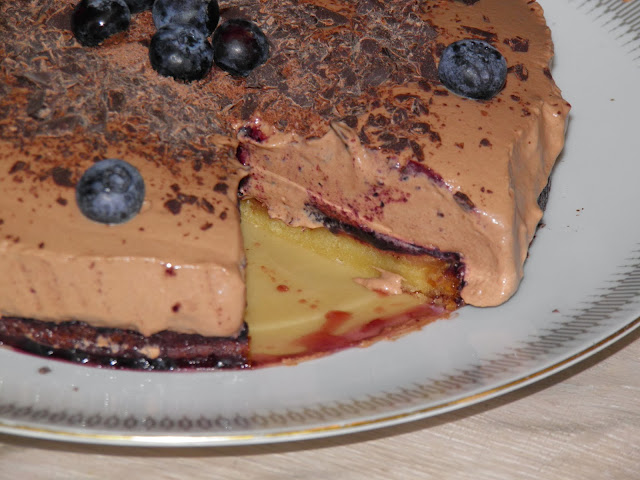 Kagen er lavet med en mandelbund smurt med blåbærmarmelade og toppet med chokoladecreme.