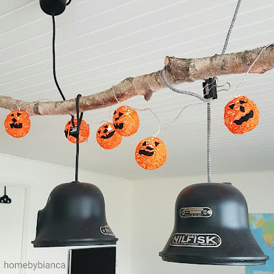 Vi har derfor lavet en fin græskar lyskæde, som nu hænger fint og pynter over vores spisebord.