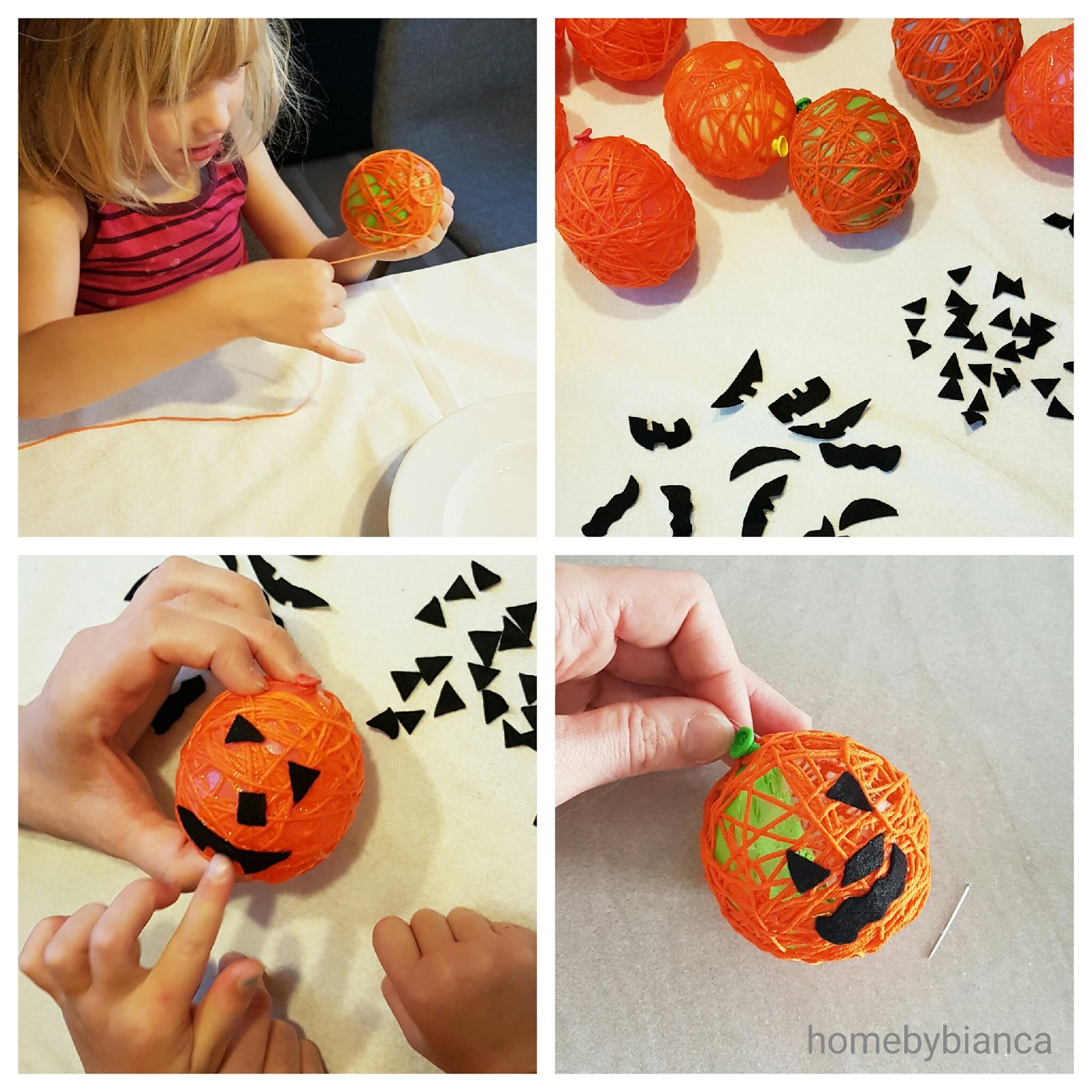 Den var super nem at lave selv. Alt du skal bruge er balloner, orange bomuldsgarn, tapetklister, sort filt og en lyskæde (som du kan købe i Ikea til bare 19 kr. til batterier)