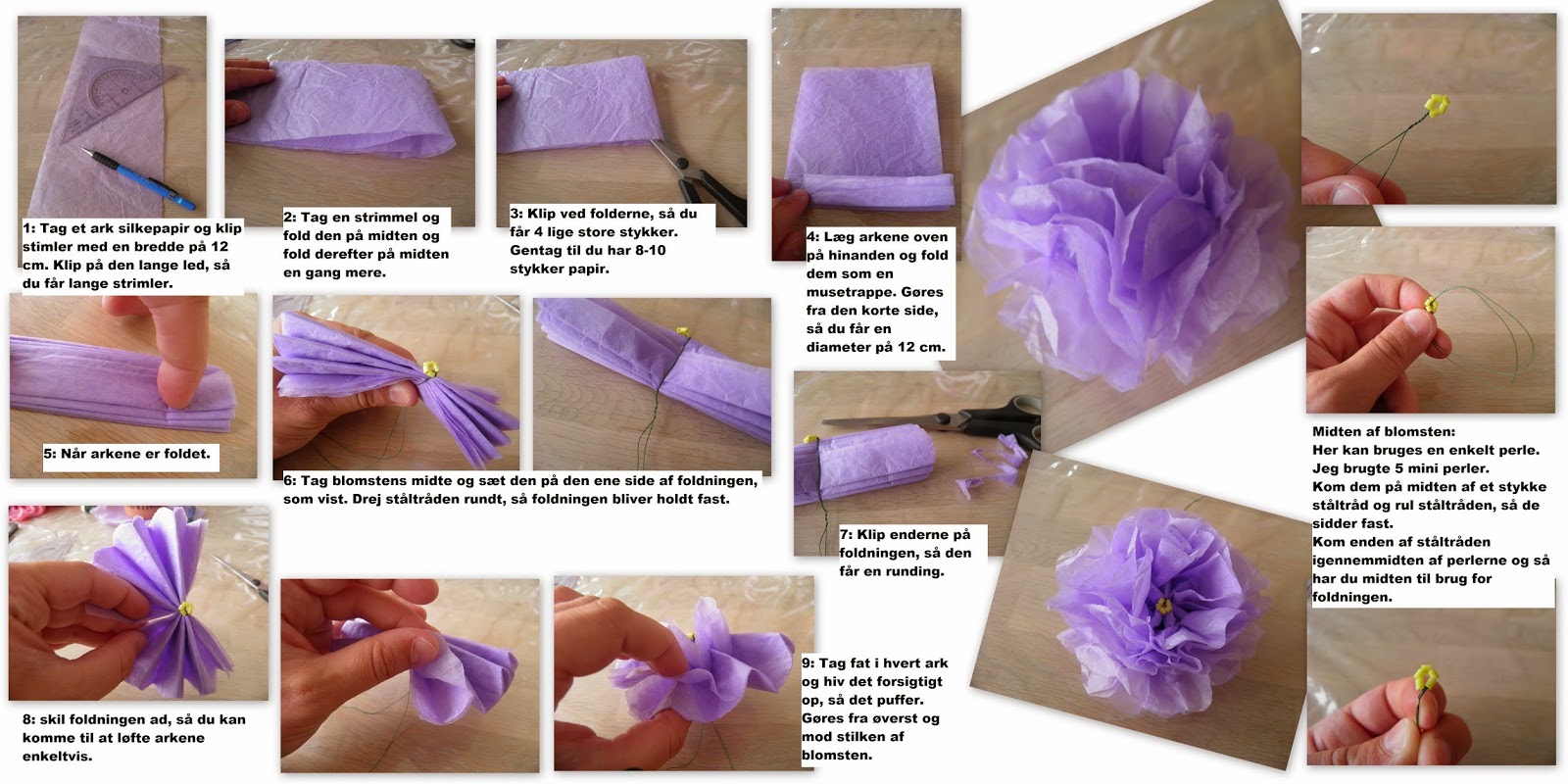 Derefter har jeg lavet silkepapirsblomsterne af nogle rester silkepapir, som jeg havde liggende. Både min søster og jeg gemmer nemlig silkepapiret når vi modtager gaver eller andet, hvor dette fine papir er brugt. Man kan selvfølgelig også vælge at købe de farver man gerne vil have.