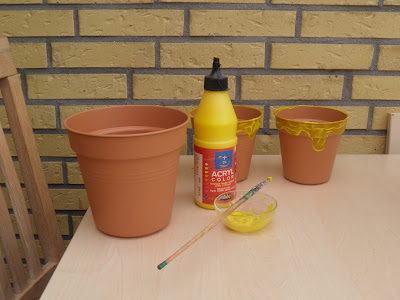 Giv potterne en kant med den gule maling, så det ligner honningen er flydt lidt ud.