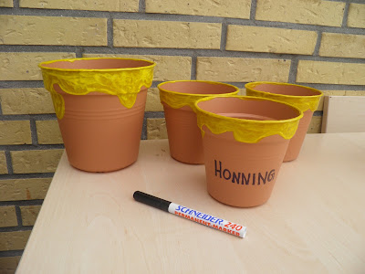 Til Peter Plys’ fødselsdagspicnic for Amilia havde jeg lavet disse fine “honningkrukker” til bestik og brødstænger.