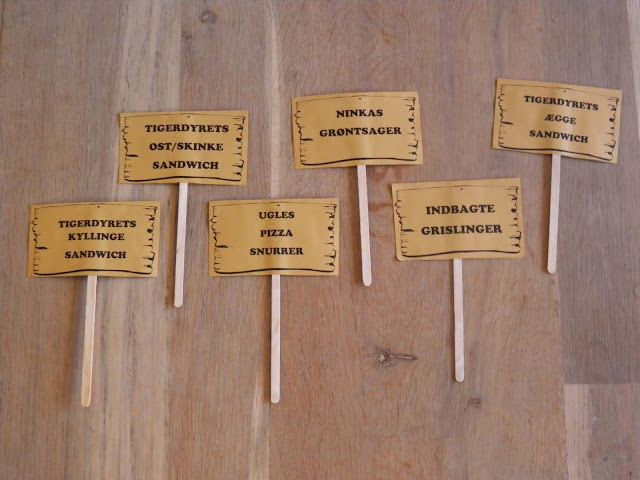 Til maden havde vi lavet skilte, som lignede små træstykker, hvorpå gæsterne kunne læse, hvad de kunne vælge imellem.